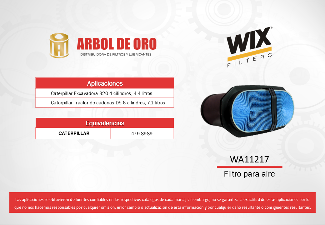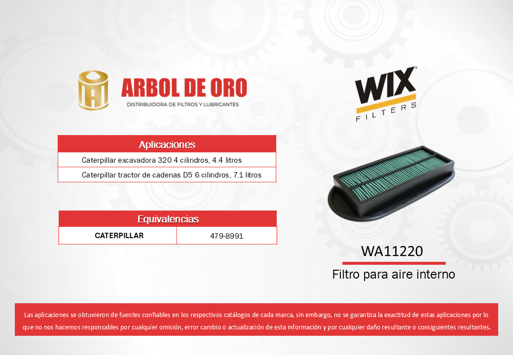 Filtro para aire de Caterpillar Excavadora 320 4 cilindros, 4.4 litros, Caterpillar Tractor de cadenas D5 6 cilindros, 7.1 litros. Número de parte Caterpillar: 479-8989