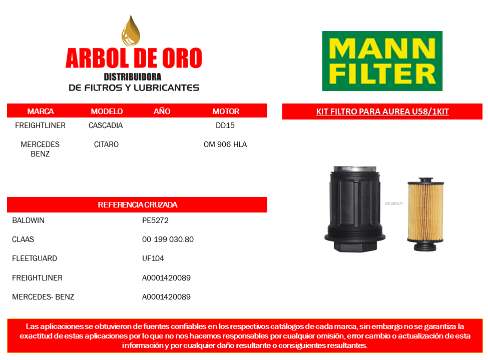 Kit filtro para AUREA Freightliner Cascadia DD15, Mercedes Benz Citaro OM 906 HLA.