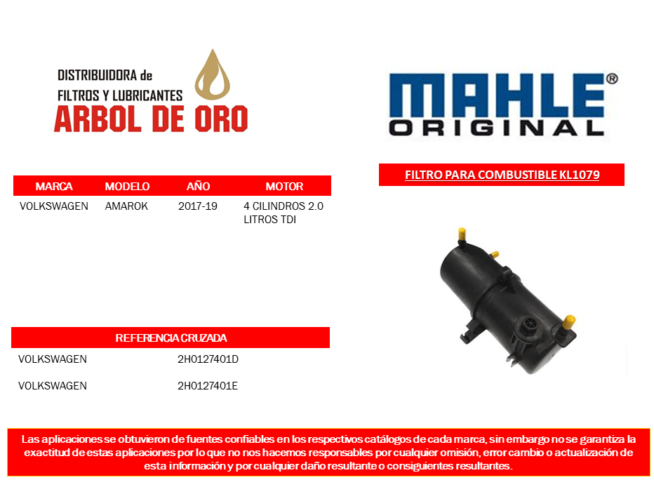 Filtro para combustible Volkswagen Amarok 4 cilindros, 2.0 litros TDI 2017-19.