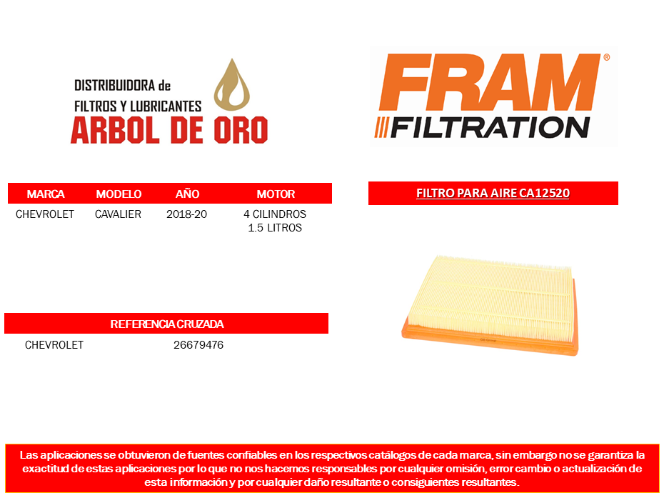 Filtro para aire Chevrolet Cavalier 4 cilindros, 1.5 litros 2018-20.