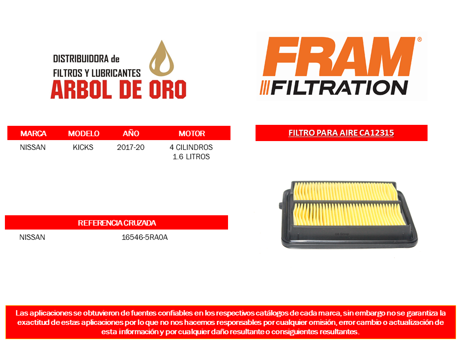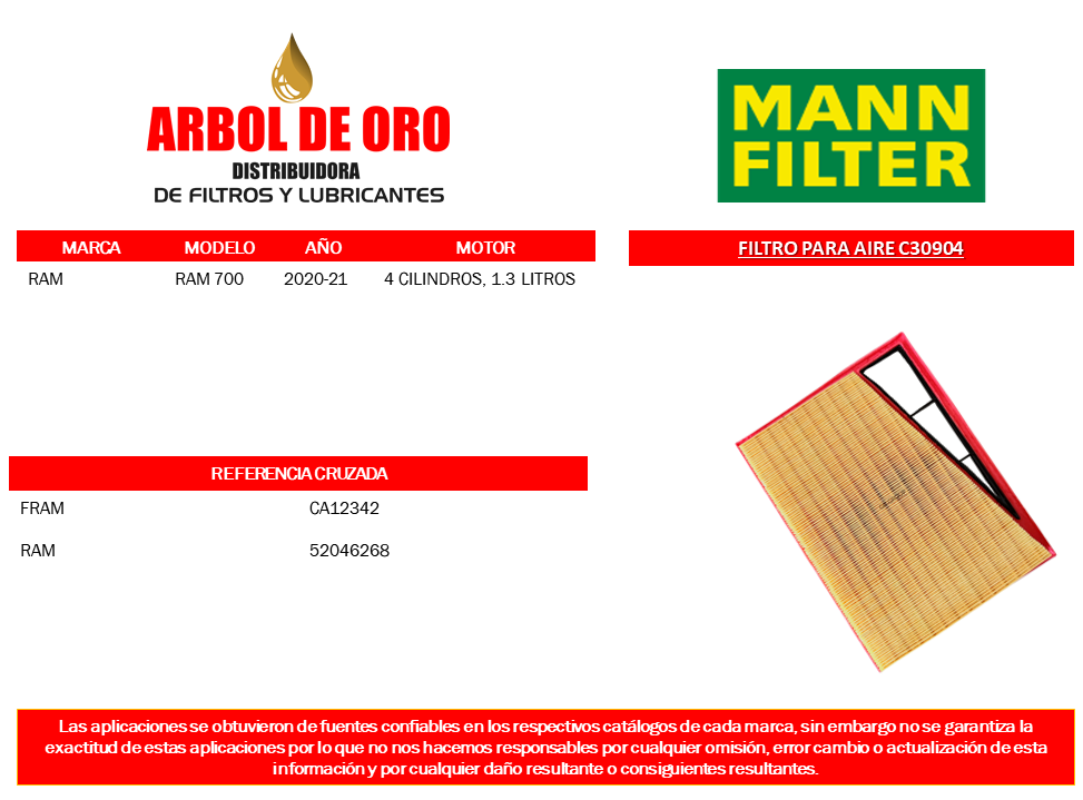 Filtro para aire de RAM 700 4 cilindros, 1.3 litros 2020-21.