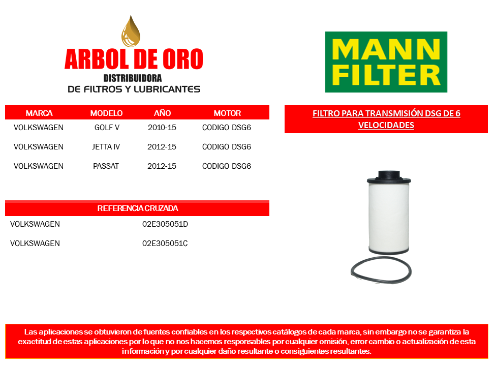 Filtro para transmision DSG de 6 velocidades de VW Golf V codigo DSG6 2010-15, VW Jetta IV codigo DSG6 2012-15, VW Passat codigo DSG6 2012-15.
