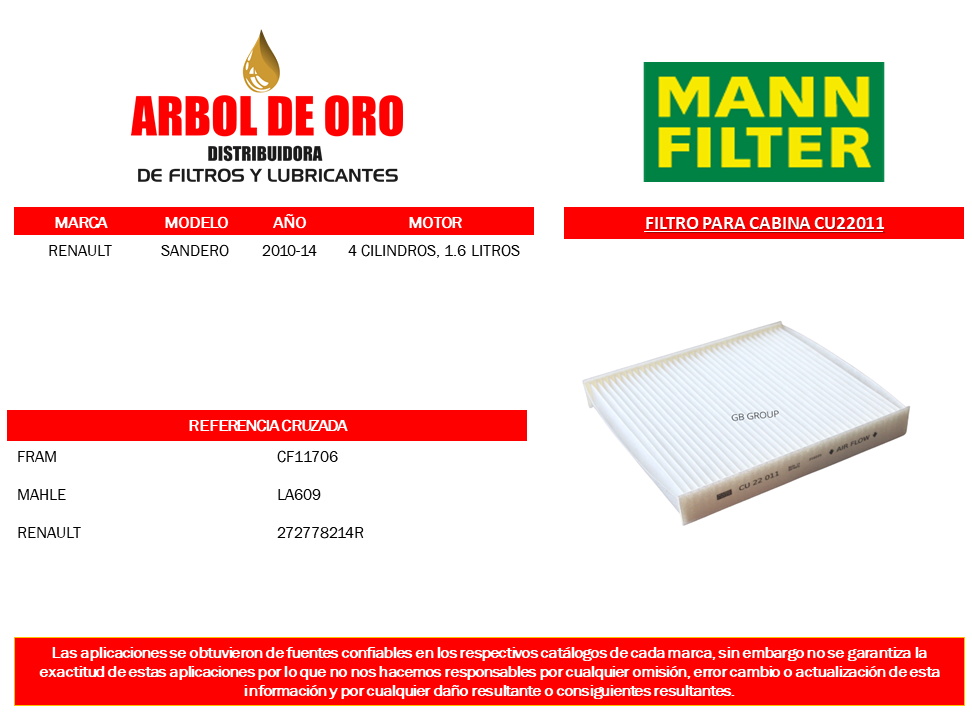 Filtro para cabina de Renault Sandero 4 cilindros, 1.6 litros 2010-14.