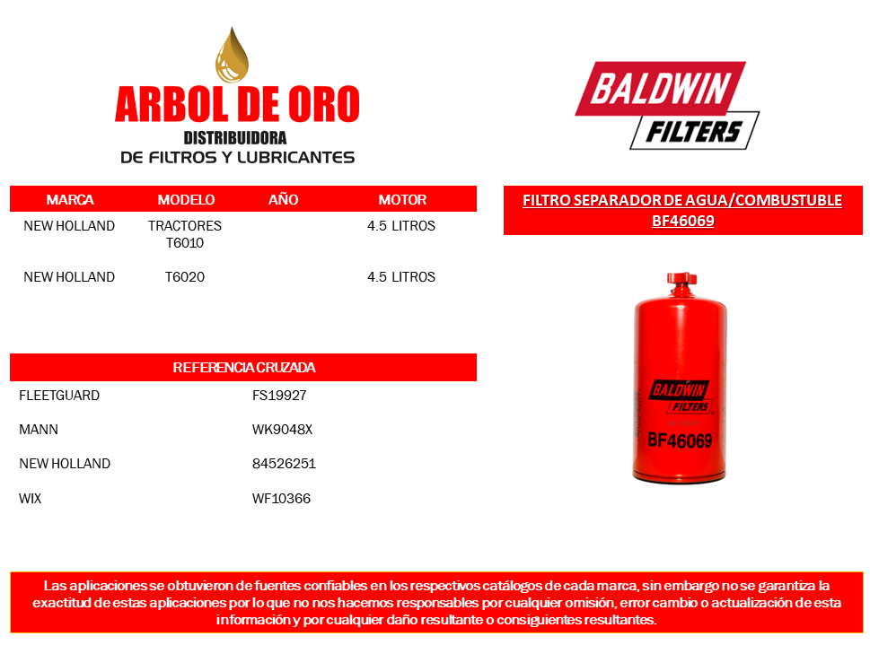 Filtro separador de agua/combustible New Holland Tractores T6010, T6020 4.5 litros.