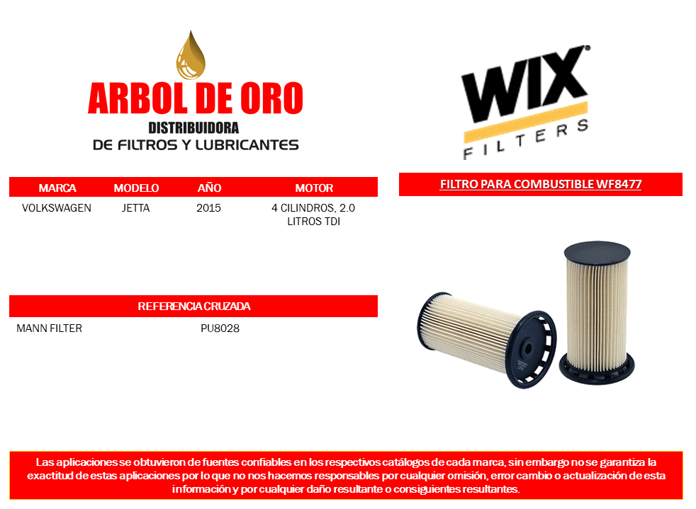 Filtro para combustible Volkswagen Jetta 4 cilindros, 2.0 litros TDI 2015