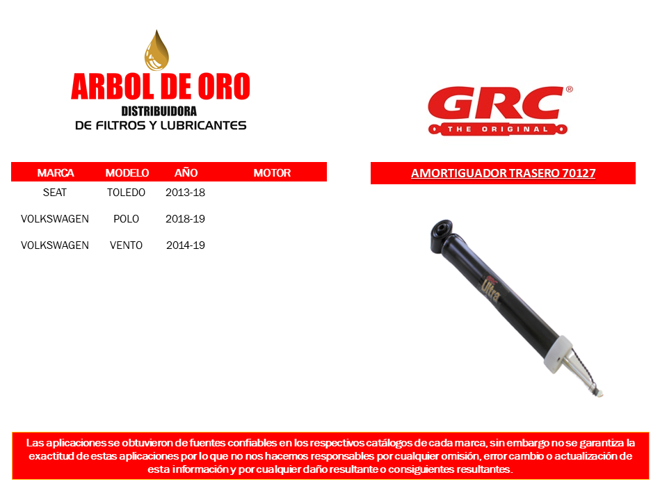 Amortiguador trasero Seat Toledo 2013-18, Volkswagen Polo 2018-29, Volkswagen Vento 2014-29.