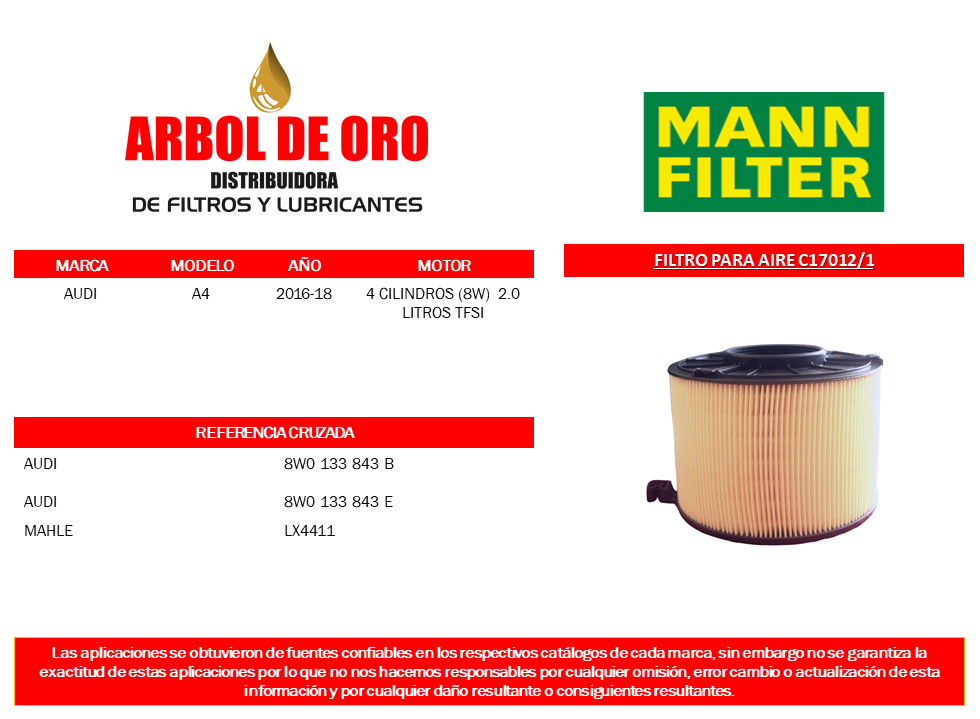 Filtro para aire Audi A4 4 cilindros (8W) 2.0 litros TFSI, 2016-18