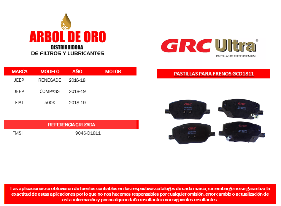 Pastillas para frenos Jeep Renegade 2016-18, Jeep Compass 2018-19, Fiat 500X 2018-19
