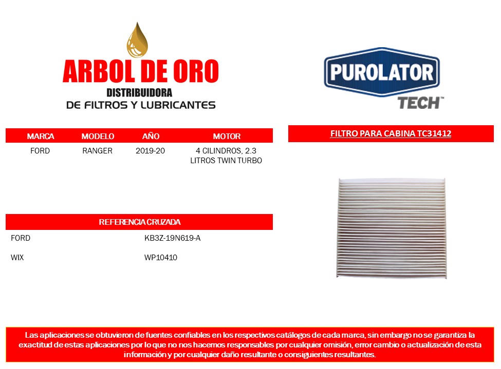 Filtro para cabina Ford Ranger 4 cilindros, 2.3 litros TWIN Turbo