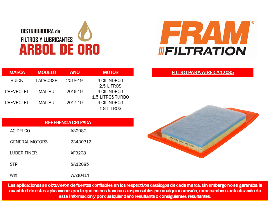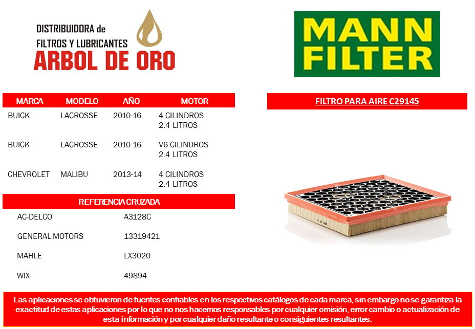 Filtro para aire Buick Lacrosse 4 cilindros, 2.4 litros 2010-16, Buick Lacrosse V6 cilindros, 2.4 litros 2010-16, Chevrolet Malibu 4 cilindros, 2.4 litros 2013-14.