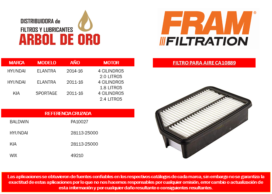 Filtro para aire Hyundai Elantra 4 cilindros, 2.0 litros 2014-16, Hyundai Elantra 4 cilindros, 1.8 litros 2011-16, Kia Sportage 2011-16, 4 cilindros 2.4 litros 2011-16.
