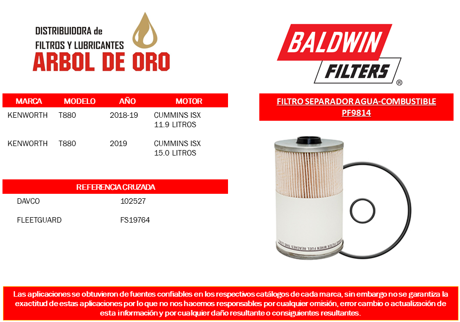 Filtro separador de agua-combustible Kenworth T880 con motor Cummins ISX 11.9 litros, Kenworth T880 con motor Cummins ISX 15.0 litros.
