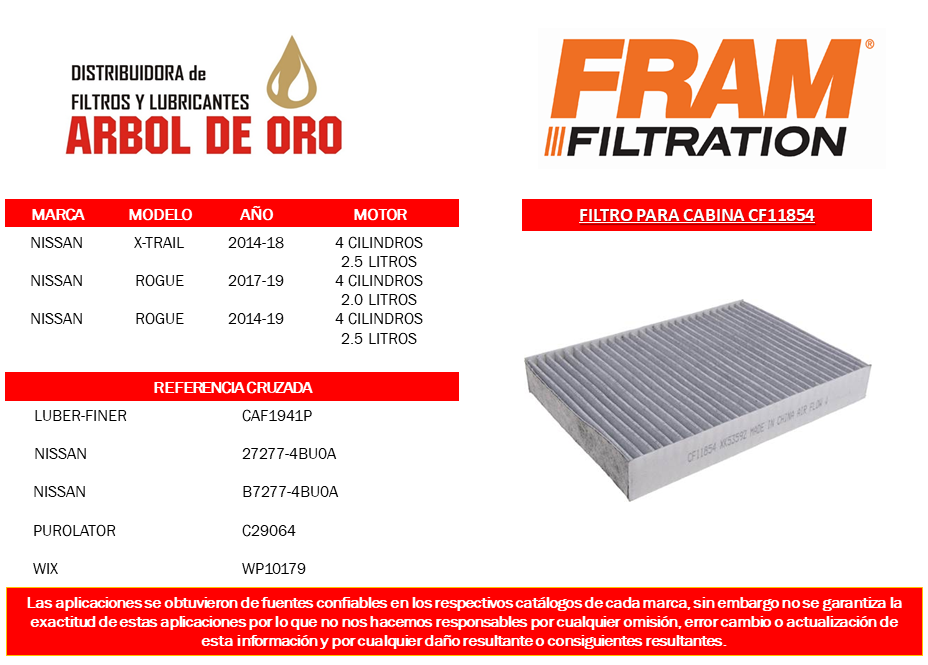 Filtro para cabina Nissan X-trail 4 cilindros, 2.5 litros 2014-18, Nissan Rogue 4 cilindros, 2.0 litros 2017-19, Nissan Rogue 4 cilindros, 2.5 litros 2014-19.