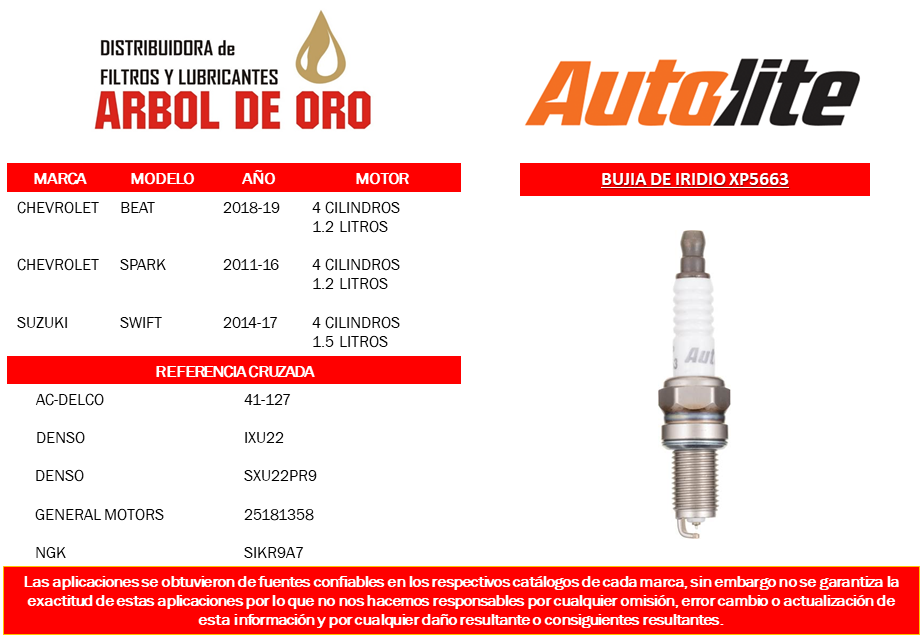Bujía punta de Iridio Chevrolet Beat 4 cilindros, 1.2 litros 2018-19, Chevrolet Spark 4 cilindros, 1.2 litros 2011-16, Suzuki Swift 4 cilindros, 1.5 litros 2014-17.