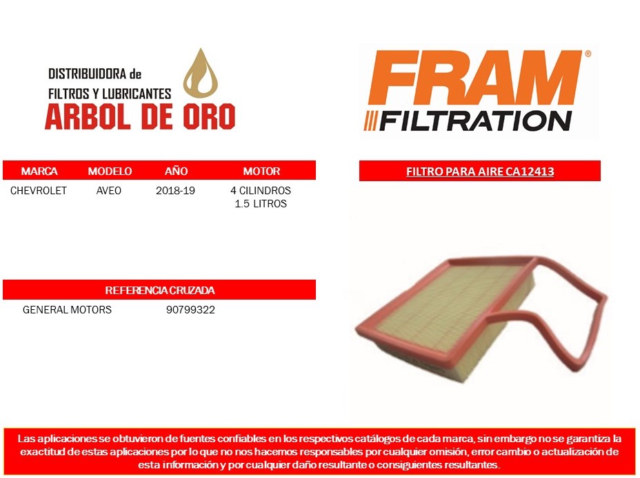 Filtro para aire Chevrolet Aveo 4 cilindros, 1.5 litros 2018-19.