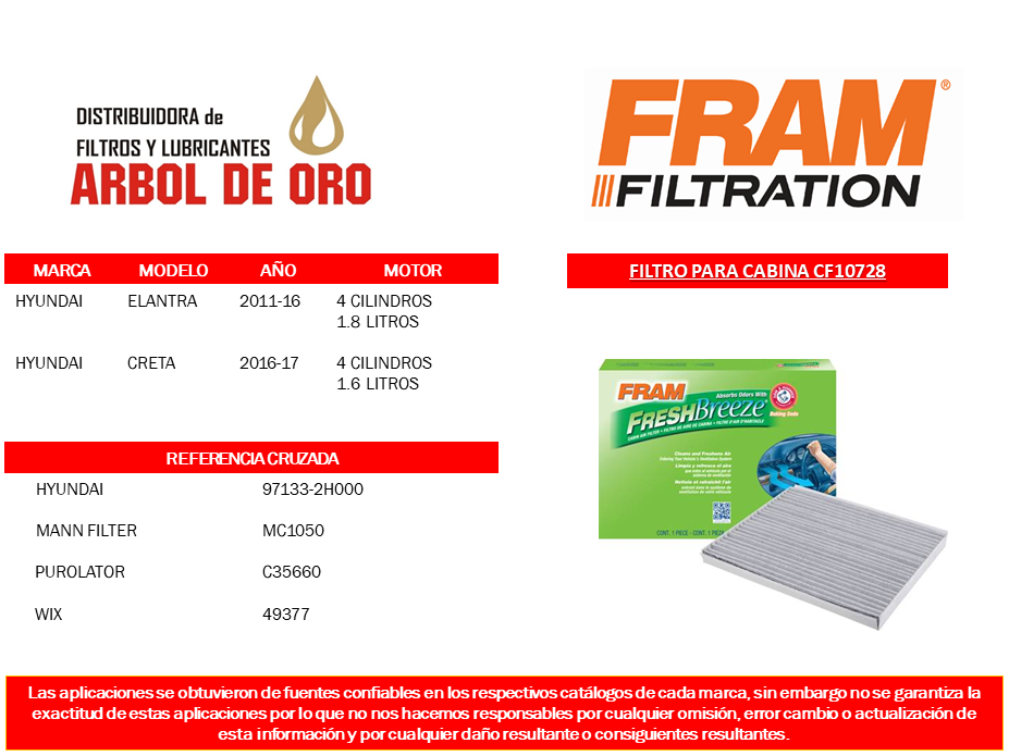 Filtro para cabina Hyundai Elantra 4 cilindros, 1.8 litros 2011-16, Hyundai Creta 4 cilindros, 1.6 litros 2016-17.