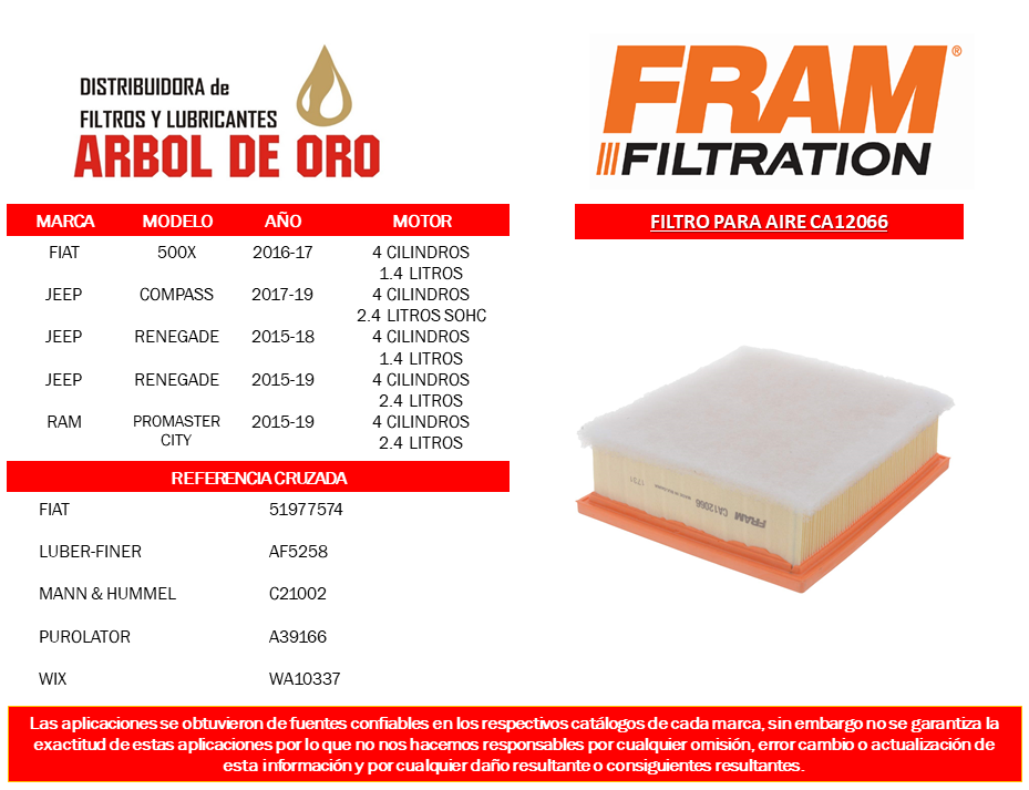 Filtro para aire Fiat 500x 4 cilindros, 1.4 litros 2016-17, Jeep Compass 4 cilindros, 2.4 litros SOHC 2017-19, Jeep Renegade 4 cilindros, 1.4 litros 2015-18, Jeep Renegade 4 cilindros, 2.4 litros 2015-19, Ram Promaster City 4 cilindros, 2.4 litros 2015-19.