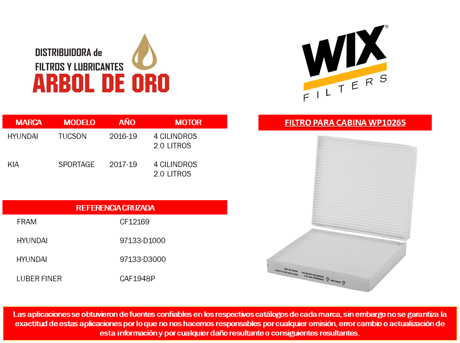 Filtro para cabina Hyundai Tucson 4 cilindros, 2.0 litros 2016-19, Kia Sportage 4 cilindros, 2.0 litros 2017-19