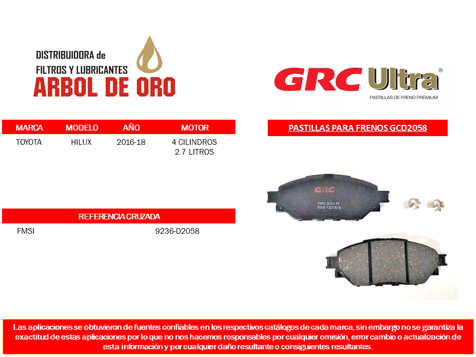 Pastillas para frenos Toyota Hilux 4 cilindros, 2.7 litros 2016-19.