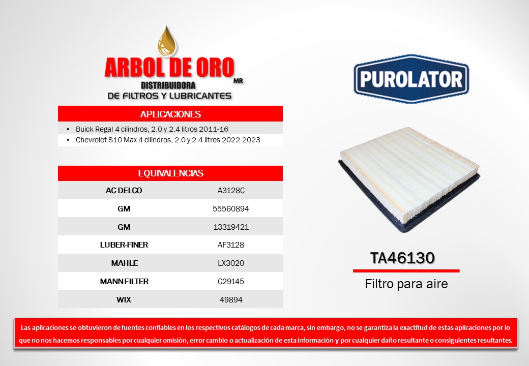 Filtro para aire de Buick Regal 4 cilindros, 2.0 y 2.4 litros 2011-16, Chevrolet S10 Max 4 cilindros, 2.0 y 2.4 litros 2022-2023. Número de parte AC DELCO: A3128C Número de parte GM: 55560894 Número de parte GM: 13319421 Número de parte Luber-Finer: AF3128 Número de parte Mahle: LX3020 Número de parte Mann Filter: C29145 Número de parte Purolator: TA46130 Número de parte Wix: 49894