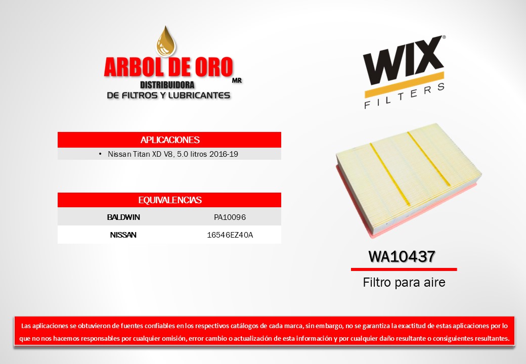 Filtro para aire de Nissan Titan XD V8, 5.0 litros 2016-19. Número de parte Baldwin:PA10096 Número de parte Nissan: 16546EZ40A