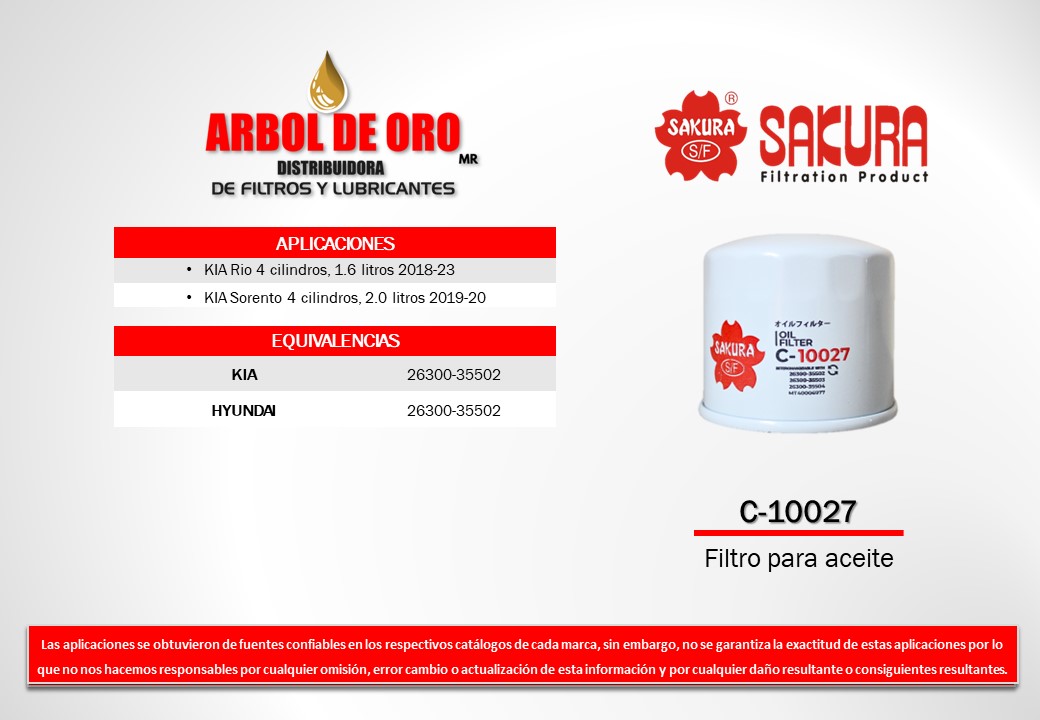 Filtro para aceite de KIA Rio 4 cilindros, 1.6 litros 2018-23, KIA Sorento 4 cilindros, 2.0 litros 2019-20. Número de parte Hyundai: 26300-35502 Número de parte KIA: 26300-35502 Número de parte Sakura: C-10027