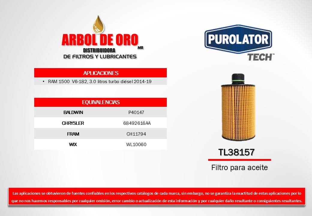 Filtro para aceite de RAM 1500 V6-182, 3.0 litros turbo diésel 2014-19. Número de parte Baldwin: P40147 Número de parte Chrysler: 68492616AA Número de parte Fram: CH11794 Número de parte Wix: WL10060