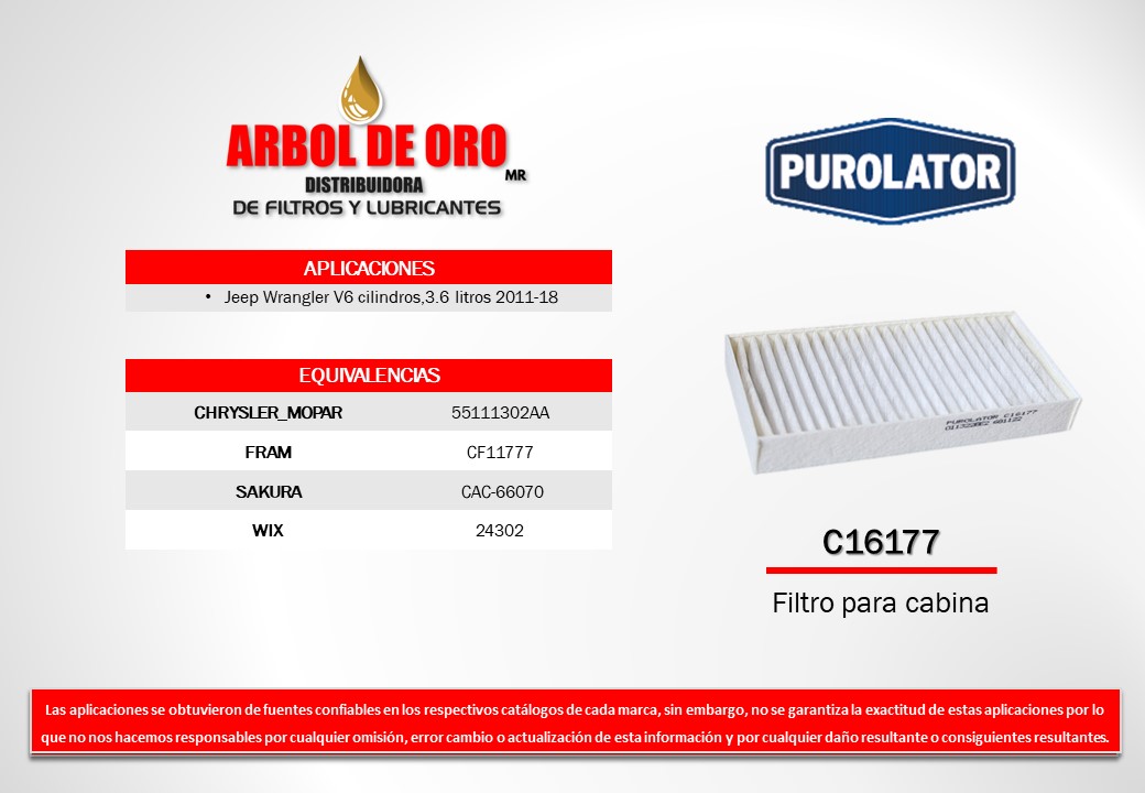 Filtro para cabina de Jeep Wrangler V6 cilindros,3.6 litros 2011-18. Número de parte Chrysler_Mopar:55111302AA Número de parte Fram: CF11777 Número de parte Purolator: C16177 Número de parte Sakura: CAC-66070 Número de parte Wix: 24302