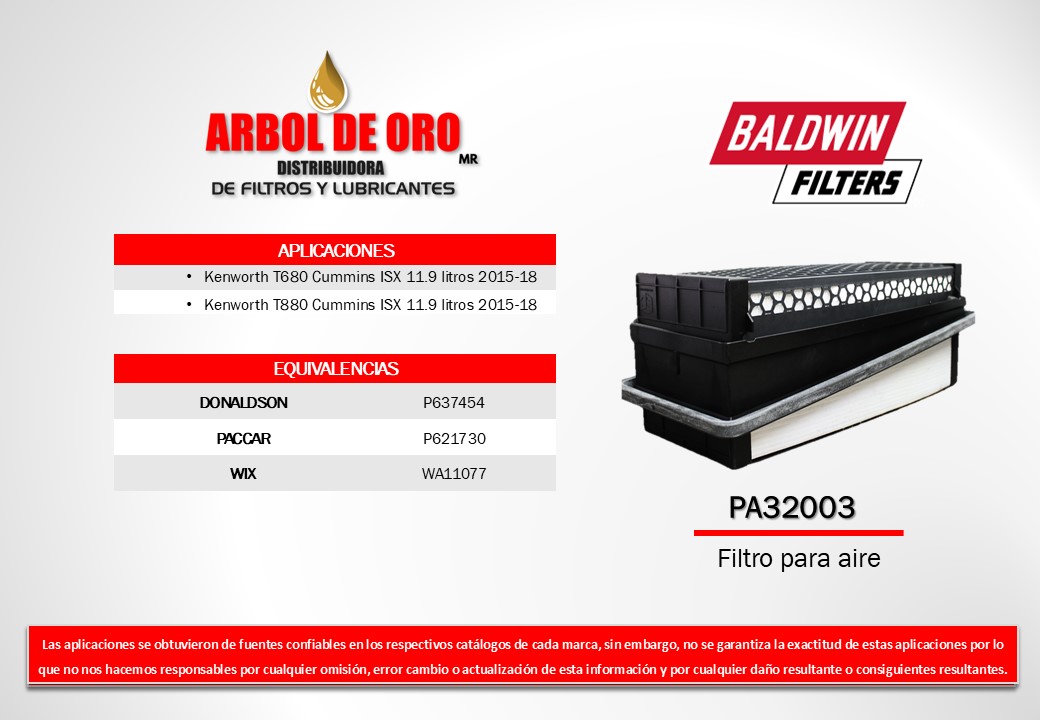 Filtro para aire de Kenworth T680 Cummins ISX 11.9 litros 2015-18, Kenworth T880 Cummins ISX 11.9 litros 2015-18. Número de parte Donaldson: P637454 Número de parte Paccar: P621730 Número de parte Wix: WA11077