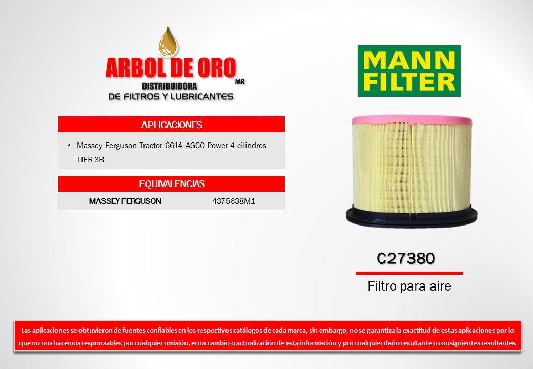 Filtro para aire de Massey Ferguson Tractor 6614 AGCO Power 4 cilindros TIER 3B.Número de parte Mann Filter: C27380 Número de parte Massey Ferguson: 4375638M1