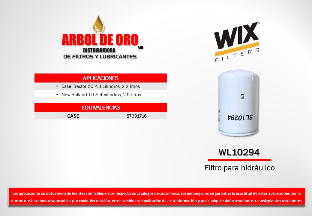 Filtro para hidráulico de Case Tractor 50 A 3 cilindros, 2.2 litros, New Holland TT55 4 cilindros, 2.9 litros. Número de parte Case: 87391716 Número de parte Wix: WL10294