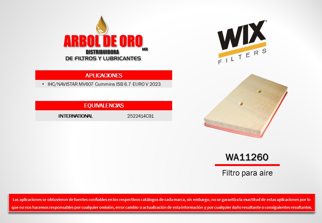 Filtro para aire de IHC/NAVISTAR MV607 Cummins ISB 6.7 EURO V 2023. Número de parte International: 2522414C91 Número de parte Wix: WA11260