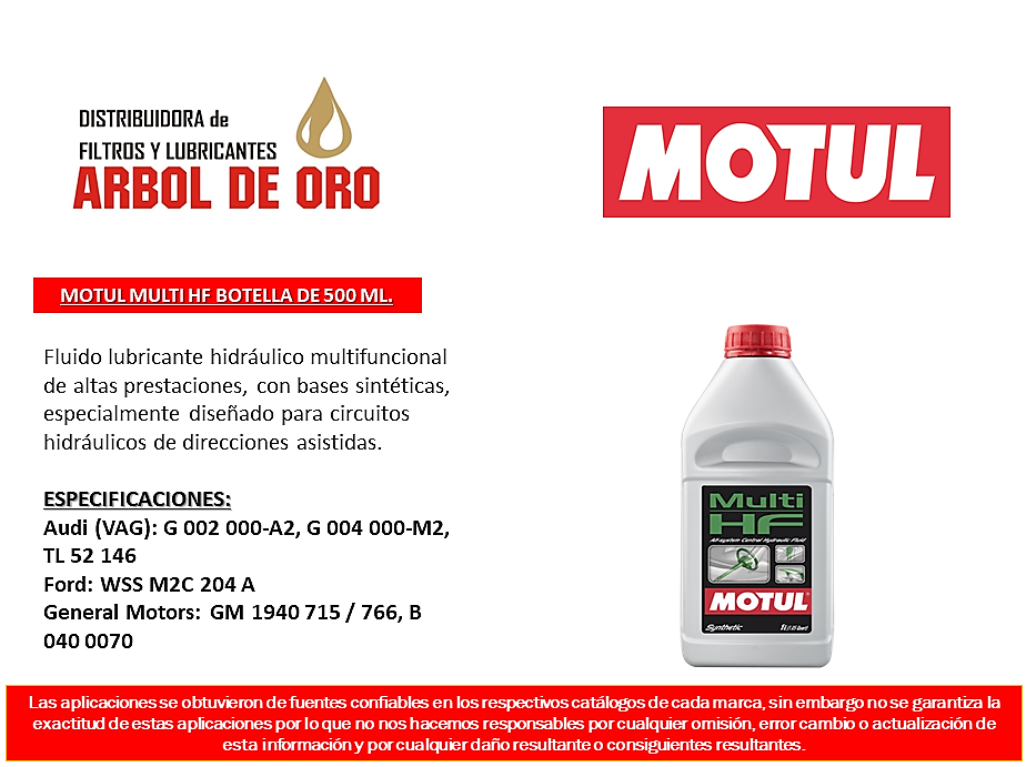 Fluido lubricante hidráulico multifuncional de altas prestaciones, con bases sintéticas, especialmente diseñado para circuitos hidráulicos de direcciones asistidas. ESPECIFICACIONES: Audi (VAG): G 002 000-A2, G 004 000-M2, TL 52 146 Ford: WSS M2C 204 A General Motors: GM 1940 715 / 766, B 040 0070