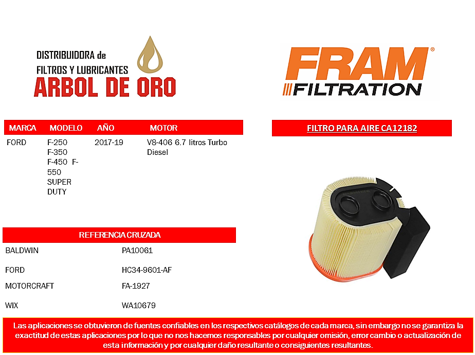 Filtro para aire F-250, F350, F-450 y F-550 Super Duty, V8 6.7 litros turbo diesel 2017-19.