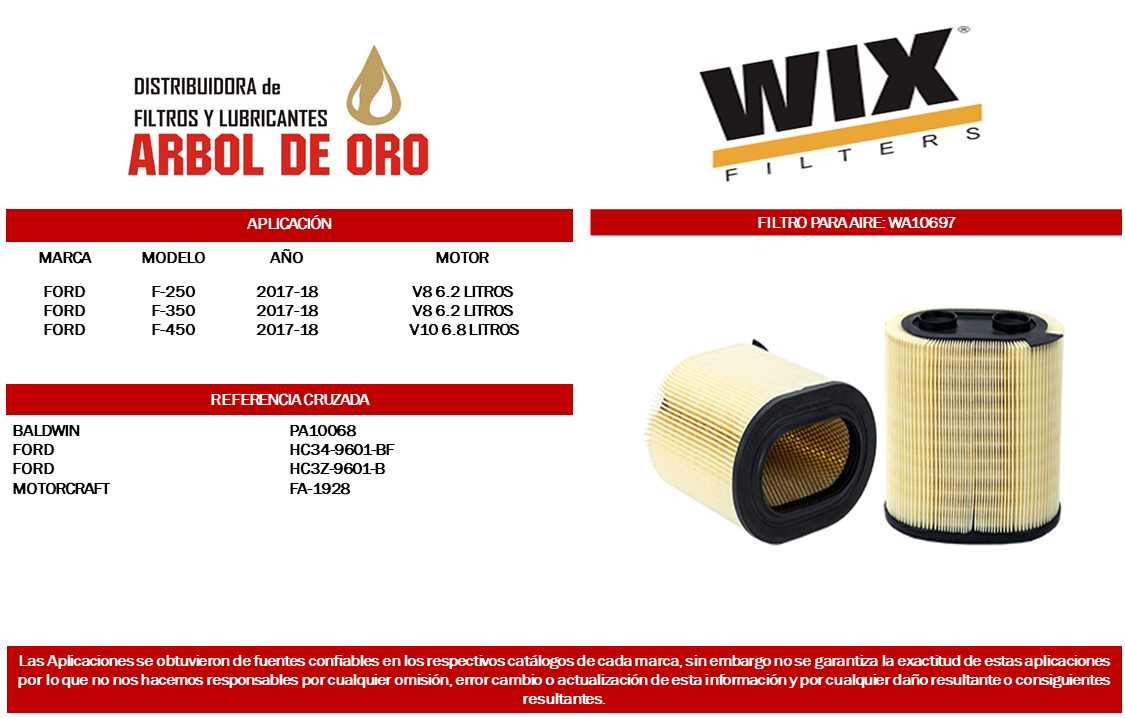 Filtro para aire Ford F-250, F-350 y F-450 V8 6.2 litros 2017-18, F-450 Y F-550 V10 6.8 litros 2017-18. Número de parte Wix: WA10697 Número de parte Ford: HC34-9601-Bf y HC3Z-9601-B