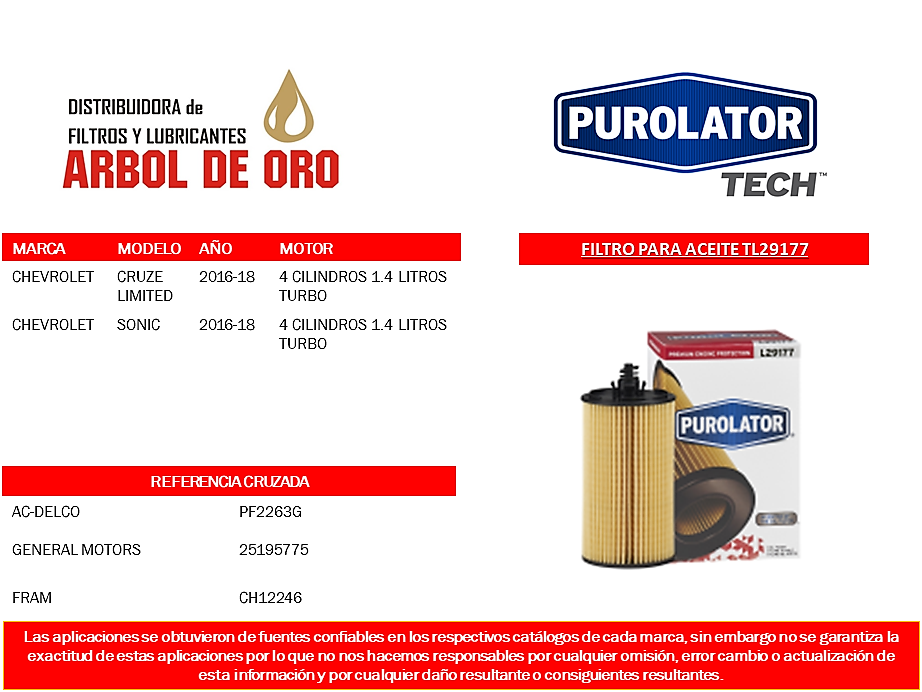 Filtro para aceite Chevrolet Cruze 4 cilindros. 1.4 litros turbo 2016-18, Chevrolet Sonic 4 cilndros, 1.4 litros turbo 2016-18. Número de parte AC-Delco: PF2263G Número de parte Fram: CH12246 Número de parte General Motors: 25195775