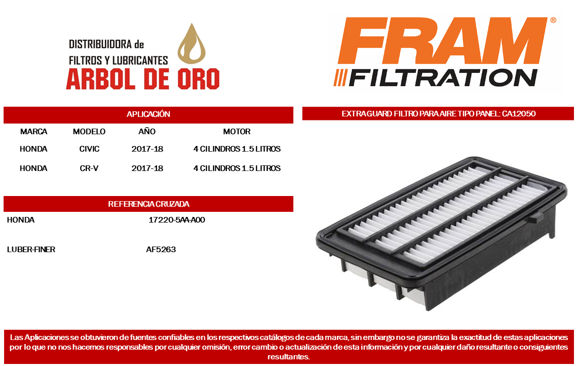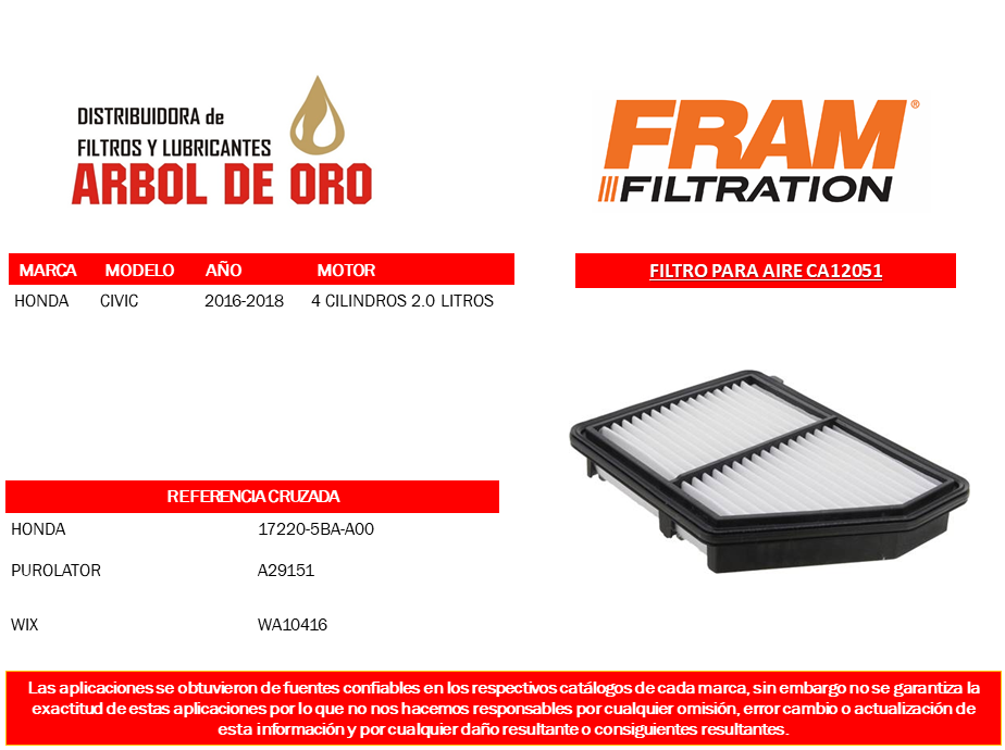 Filtro para aire Honda Civic 4 cilindros, 2.0 litros 2016-18. Número de parte Honda: 17220-5BA-A00 Número de parte Purolator: A29151 Número de parte Wix: WA10416