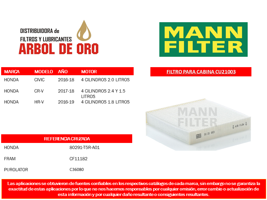 Filtro para cabina Honda Civic 4 cilindros, 2.0 litros 2016-18, Honda CR-V 4 cilindros, 2.4 y 2.5 litros 2017-18, Honda HR-V 4 cilindros, 1.8 litros 2016-19. Número de parte Fram: CF11182 Número de parte Honda: 80291-T5R-A01 Número de parte Mann: CU21003 Número de parte Purolator: C36080