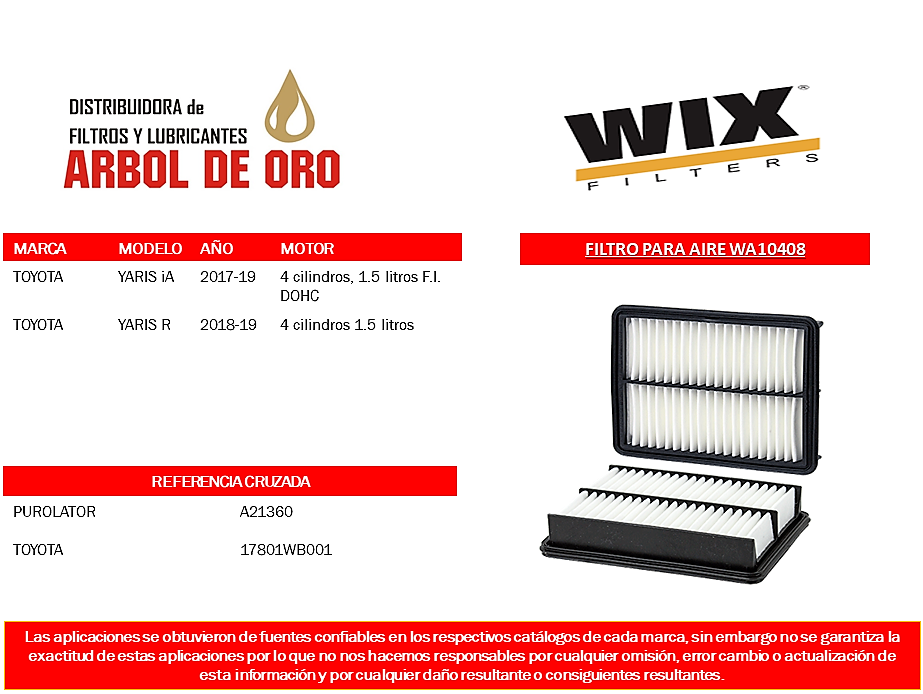Filtro para aire Toyota Yaris R 4 cilindros, 1.5 litros 2018-19. Número de parte Toyota: 17801WB001 Número de parte Purolator: A21360