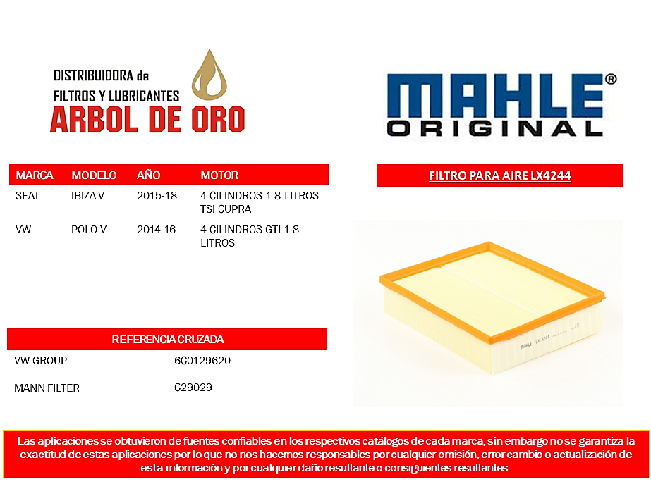 Filtro para aire Seat Ibiza V 4 cilindros, 1.8 litros TSI CUPRA 2015-18, VW Polo V 4 cilindros GTI, 1.8 litros 2014-16. Número de parte VW GROUP (AUDI/SEAT/SKODA/VW): 6C0129620 Número Mann Filter: C29029