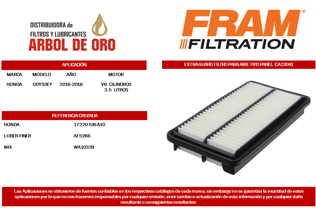 Publicado en: Abril 2018Filtro para aire Honda Odyssey V6, 3.5 litros 2018 Número de parte Fram: CA10261 Número de parte Honda: 17220-5J6-A10
