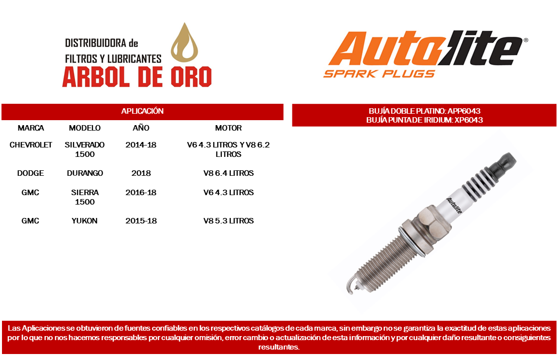 Publicado en: Julio 2018Bujía doble punta de platino y Bujía punta de iridium Chevrolet Silverado 1500 V6 4.3 litros 2014-18, Dodge Durango V8 6.4 litros 2018, GMC Sierra 1500 V6 4.3 litros 2016-18 Número de parte Autolite Doble punta de platino: APP6043 Número de parte Autolite punta de iridium: XP6043