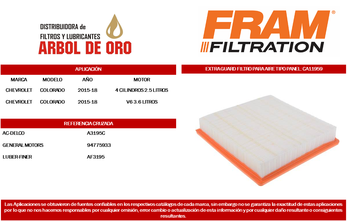 Publicado en: Mayo 2018Filtro para aire Chevrolet Colorado 4 cilindros, 2.5 litros 2015-18, Chevrolet Colorado V6, 3.6 litros 2015-18 Número de parte Fram: CA11959 Número de parte AC-Delco: A3195C