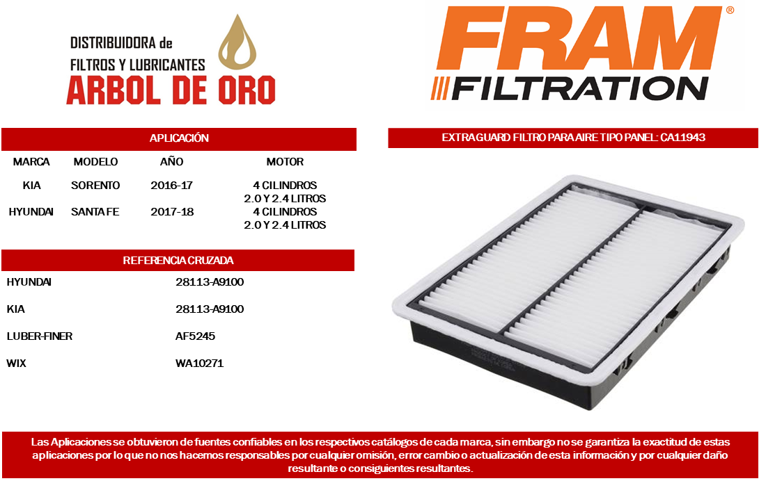Publicado en: Mayo 2018Filtro para aire Hyundai Santa Fe 4 cilindros, 2.0 y 2.4 litros 2016-17, KIA Sorento 4 cilindros, 2.0 y 2.4 litros 2017-18 Número de parte Fram: CA11943 Número de parte Hyundai: 28113-A9100 Número de parte KIA: 28113-A9100