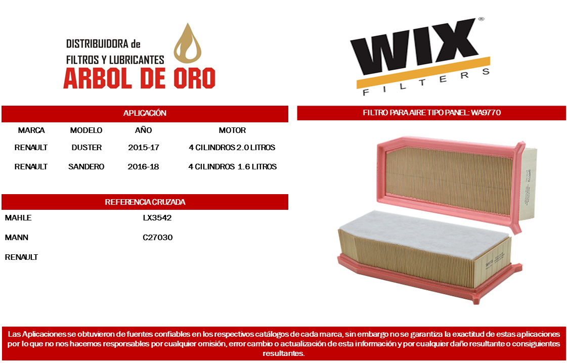 Publicado en: Mayo 2018Filtro para aire Renault Duster 4 cilindros, 2.0 litros 2015-17 Número de parte Wix: WA9770 Número de parte Renault: 165467674R