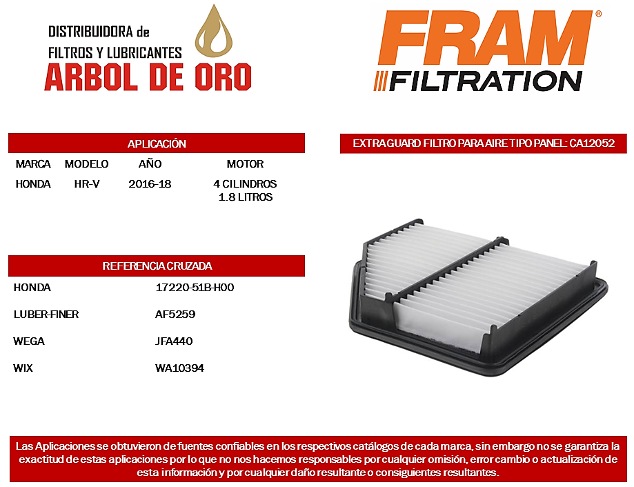 Publicado en: Abril 2018Filtro para aire Honda HR-V 4 cilindros, 1.8 litros 206-18 Número de parte Fram CA10252 Número de parte Honda: 17220-51B-H00