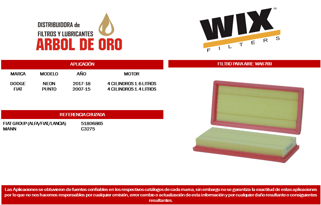 Filtro para aire Dodge Neon 4 cilindros 1.6 litros 2017-18 Número de parte Wix: WA6769 Número FIAT GROUP: 51806865
