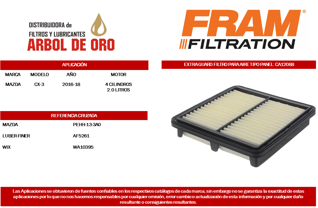 Publicado en: Julio 2018Filtro para aire Mazda CX-3 4 cilindros, 2.0 litros 2016-18 Número de parte Fram: CA12088 Número de parte Mazda: PEHH-13-3A0
