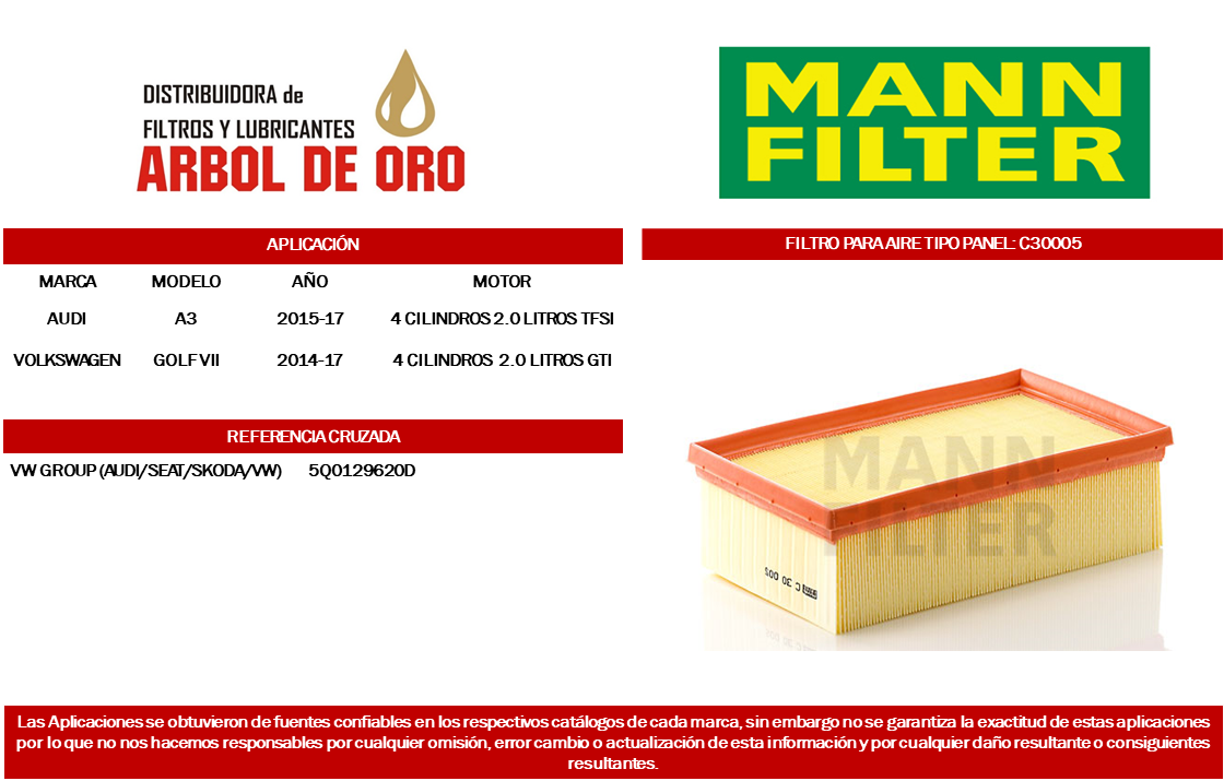 Publicado en: Mayo 2018Filtro para aire Audi A3 4 cilindros, 2.0 litros TFSI 2015-17, Volkswagen Golf VII 4 cilindros, 2.0 litros GTI 2014-17 Número de parte Mann: C30005 Número de parte VW GROUP (AUDI/SEAT/SKODA/VW): 5Q0129620D