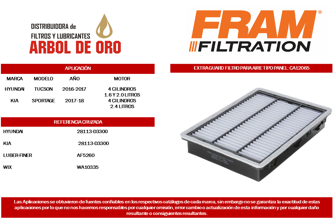 Publicado en: Abril 2018Filtro para aire Hyundai Tucson 4 cilindros, 1.6 y 2.0 litros 2016-17, KIA Sportage 4 cilindros, 2.4 litros 2017-18 Número de parte Fram: CA12065 Número de parte Hyundai:28113-D3300